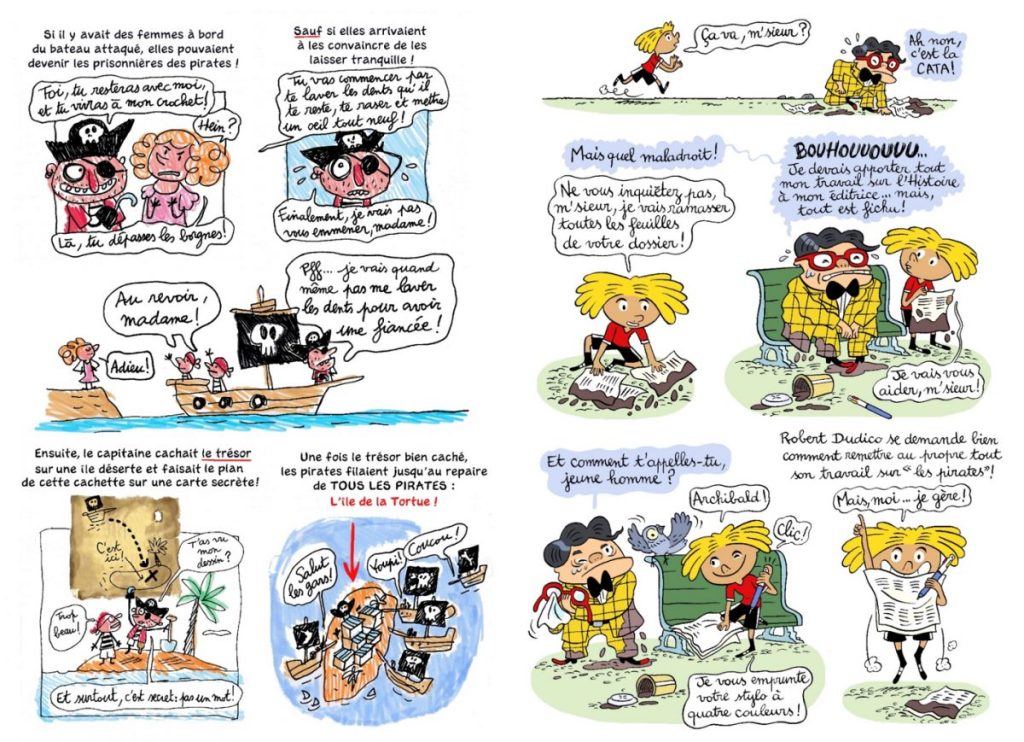 Le professeur Dudico se rend chez son éditrice. Mais patatra, quel maladroit ! Le voilà qui trébuche et ruine tout son travail de recherches sur les pirates. Impossible d’aller à son rendez-vous dans cet état et surtout pas… sans ses notes ! Pas de panique, Archibald, enfant zèbre, incollable sur tous les sujets, lui vient en aide et lui propose le meilleur des exposés sur les pirates !